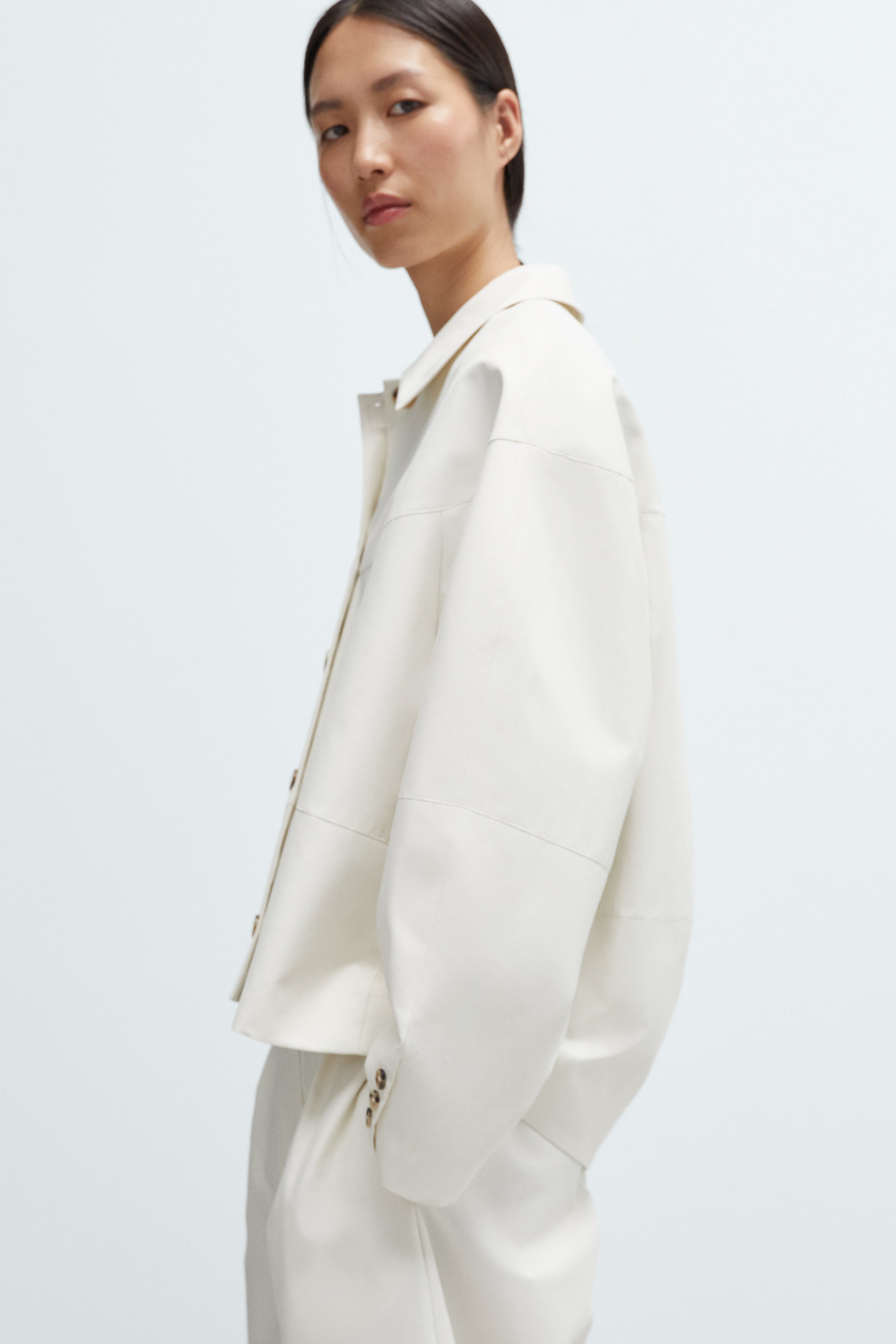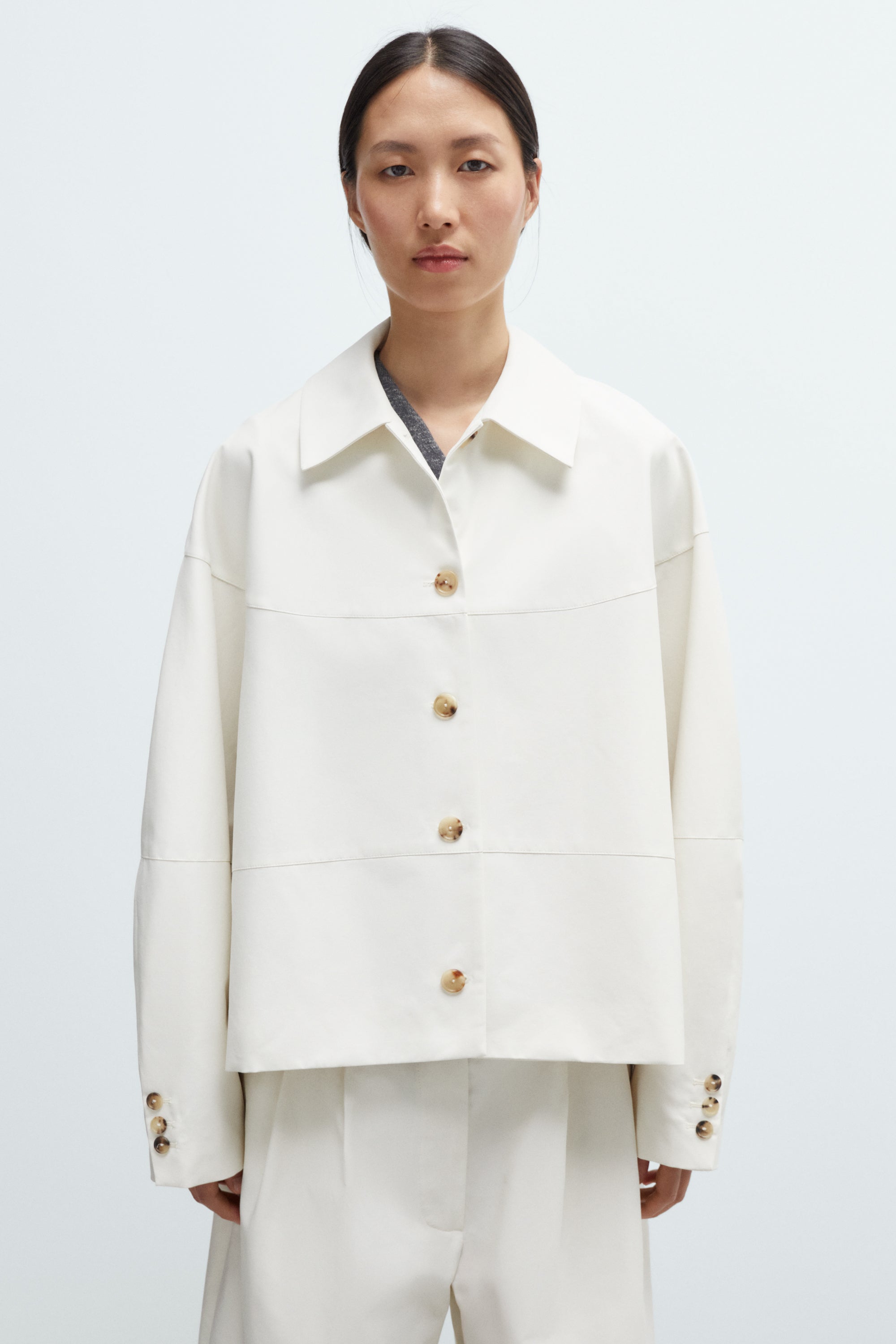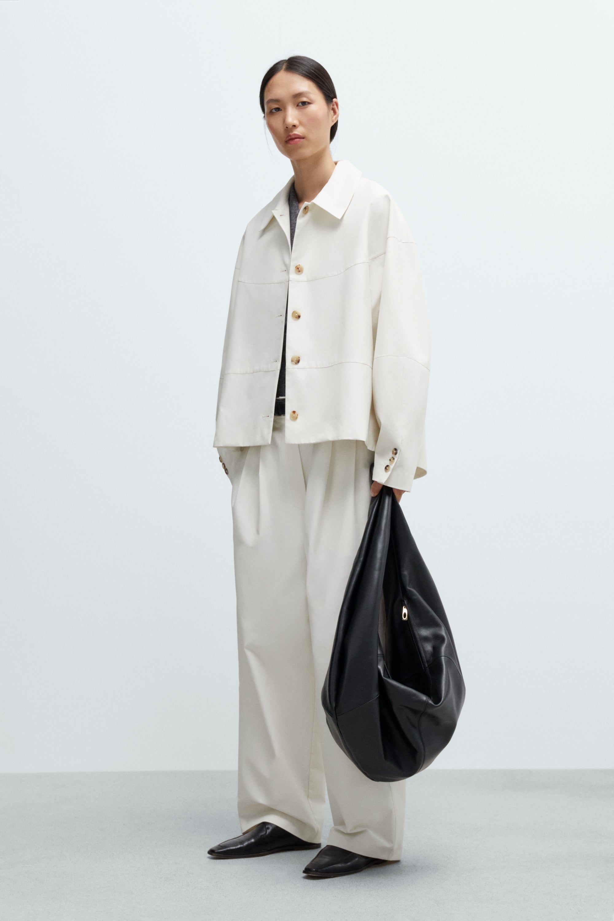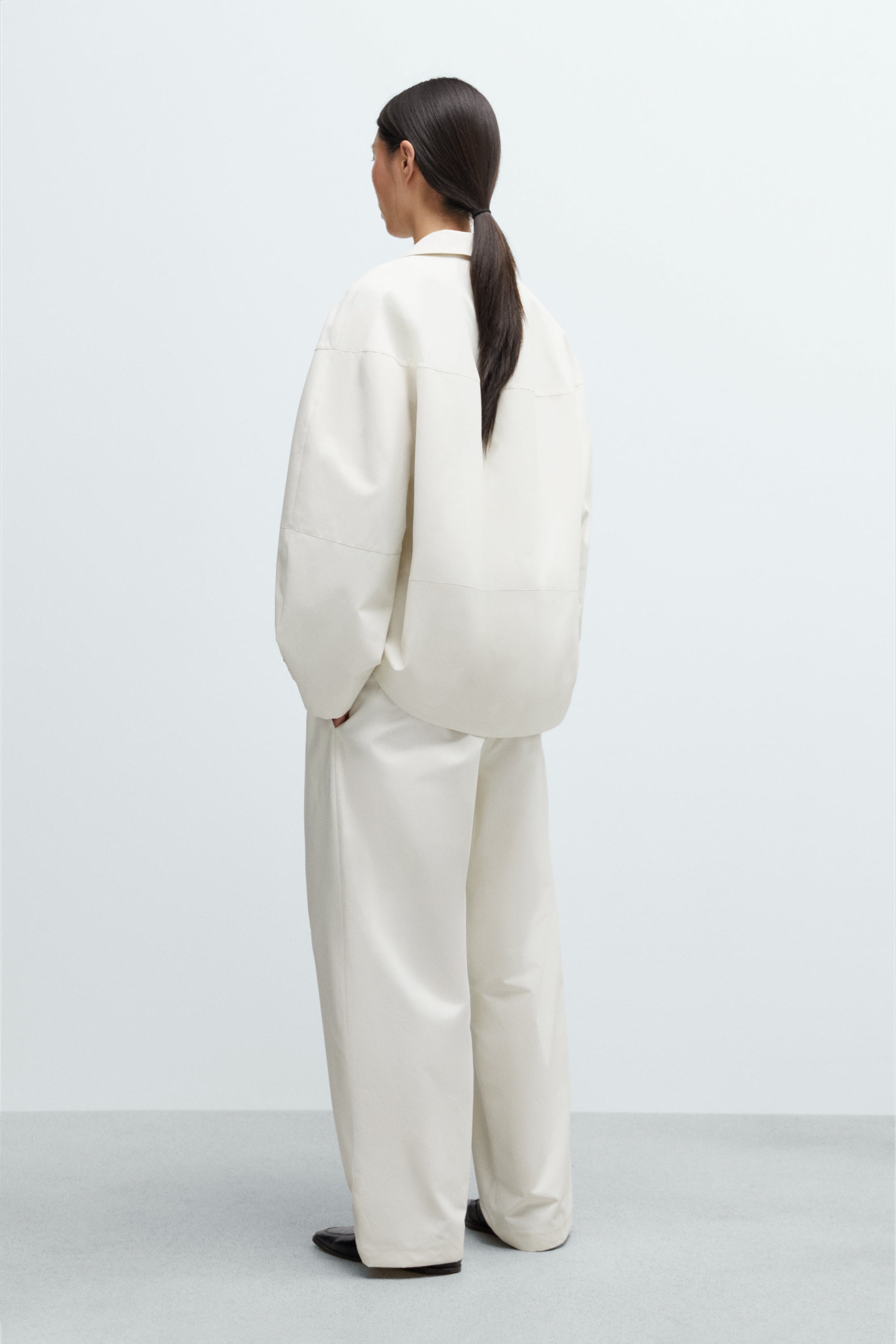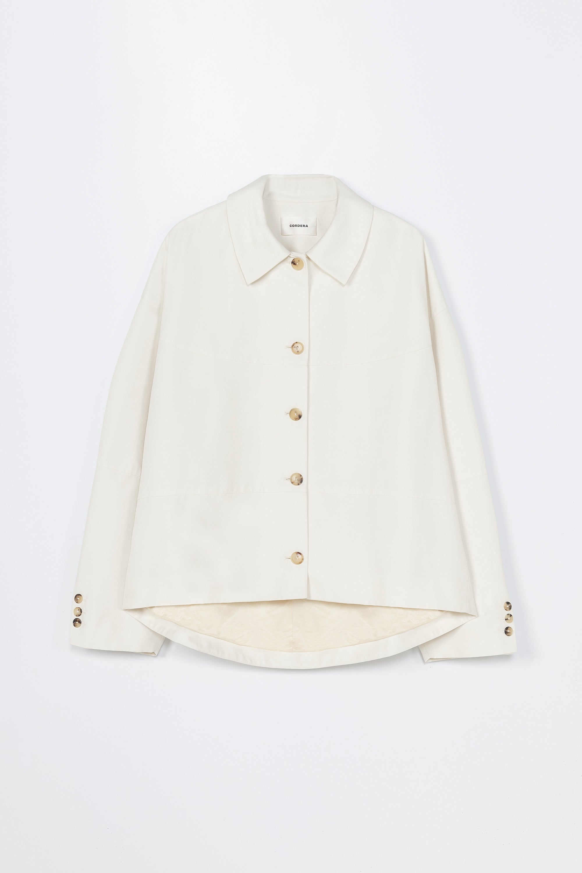 A short technical fabric jacket with an oversized cocoon shape. It features a pointy collar, front button closure, and buttons on the cuffs. The jacket has dropped shoulders, a high-low hem that is longer at the back, and rounded sleeves for a modern silhouette. Pair it with the matching pants or skirt for a perfect total look.