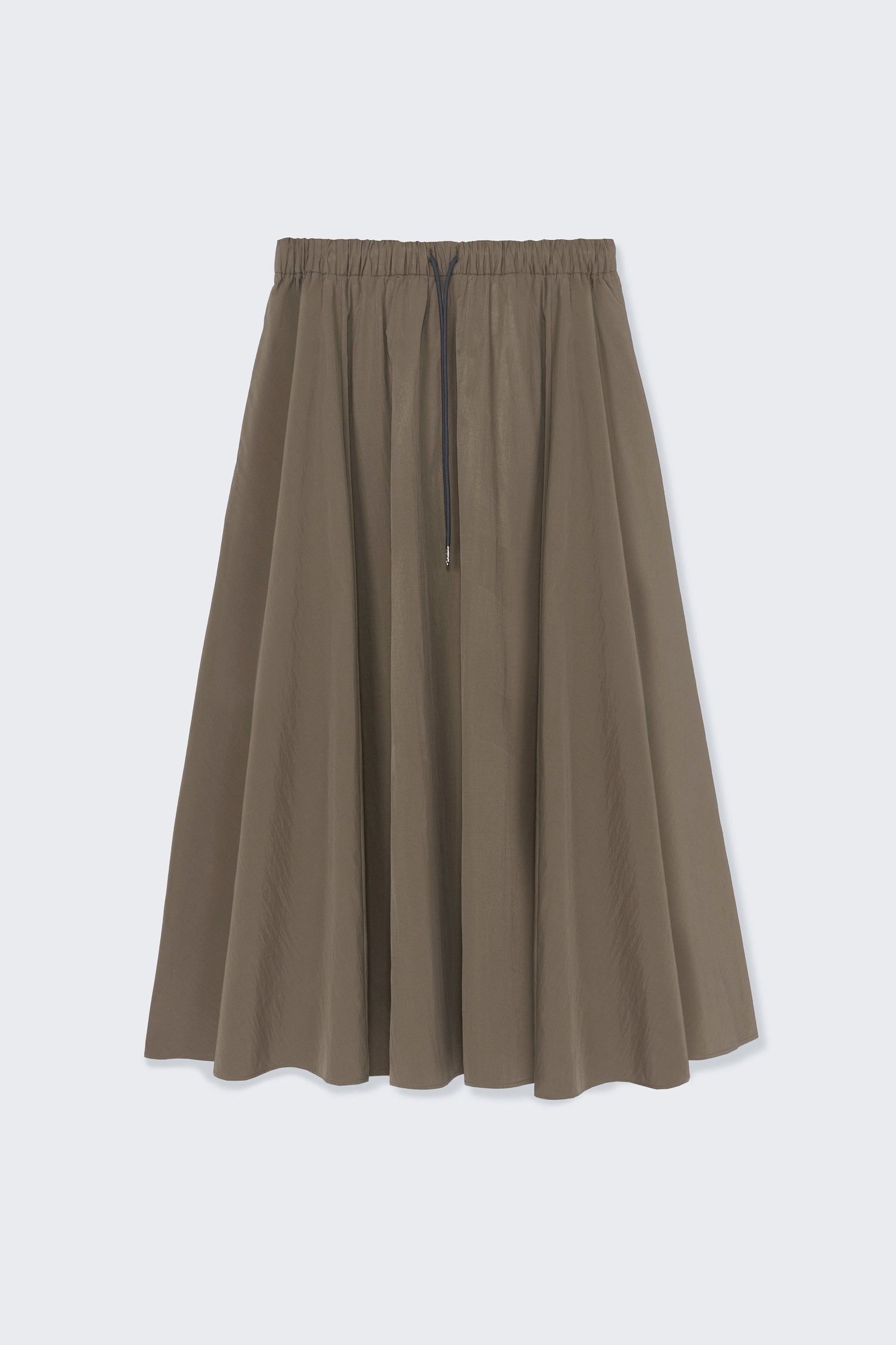 This skirt is designed with a mid-length circular shape and crafted from a light fabric. It features an elasticated waistband with a drawstring and contrasting cord and side pockets. The skirt’s weight adds elegant movement and volume to your look, with an elegant timeless vetiver color.