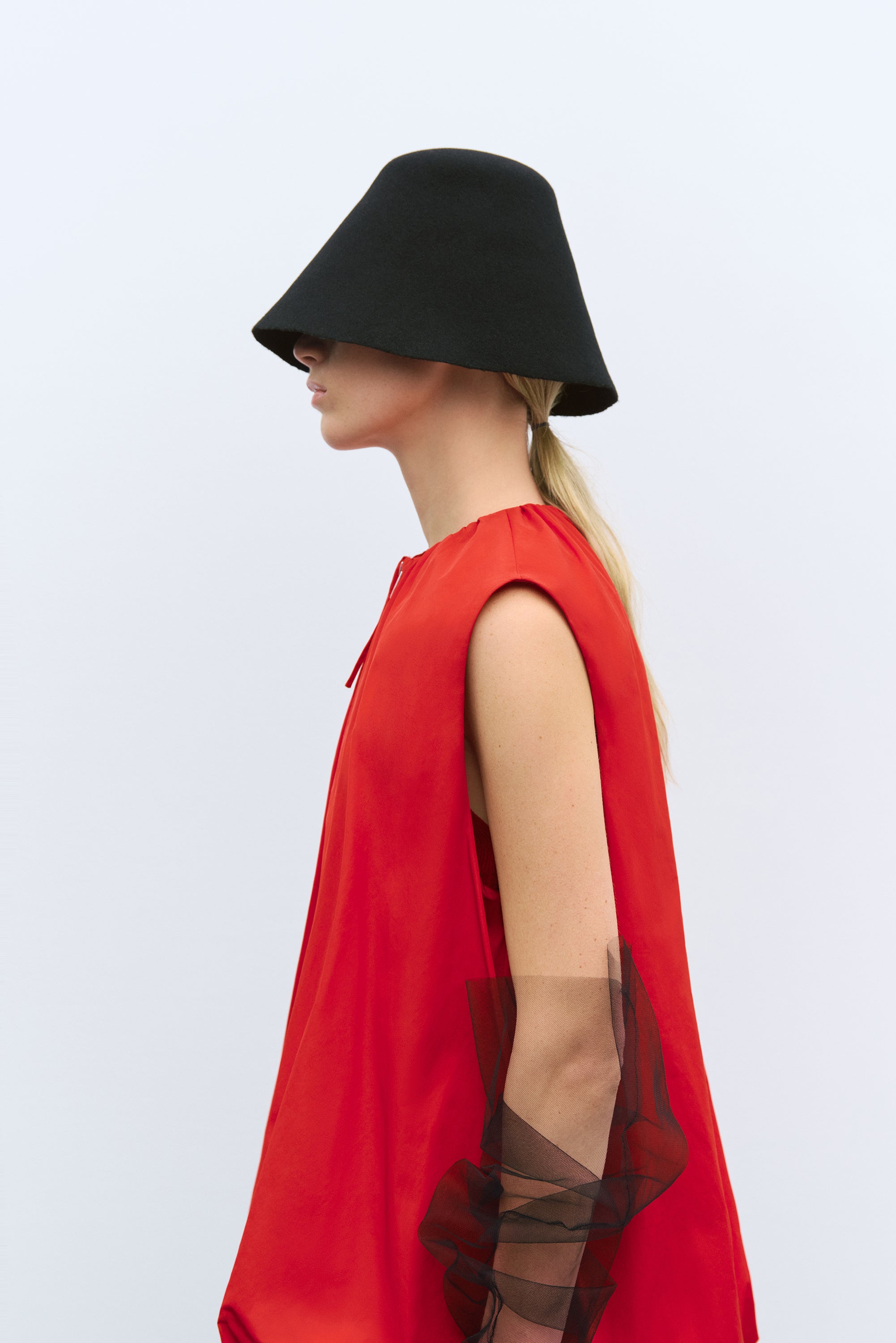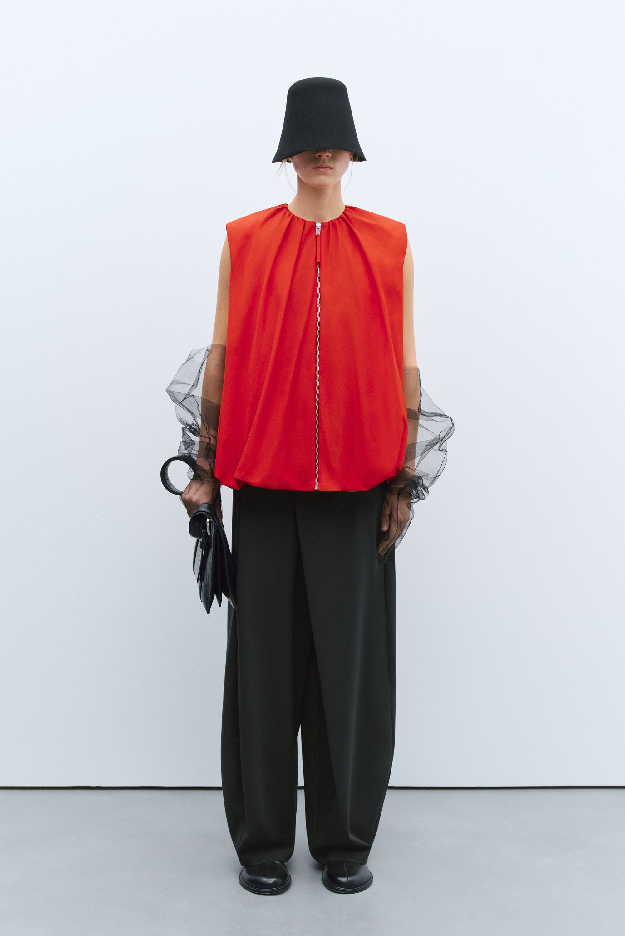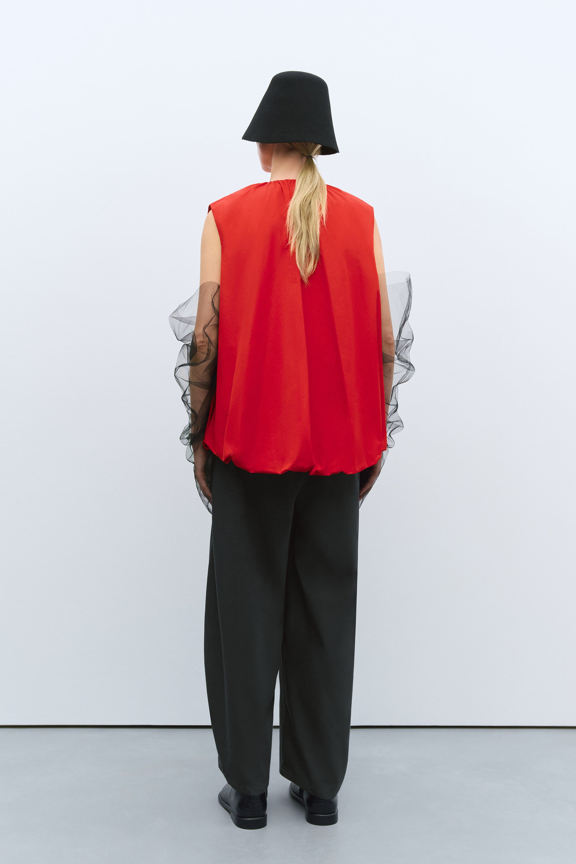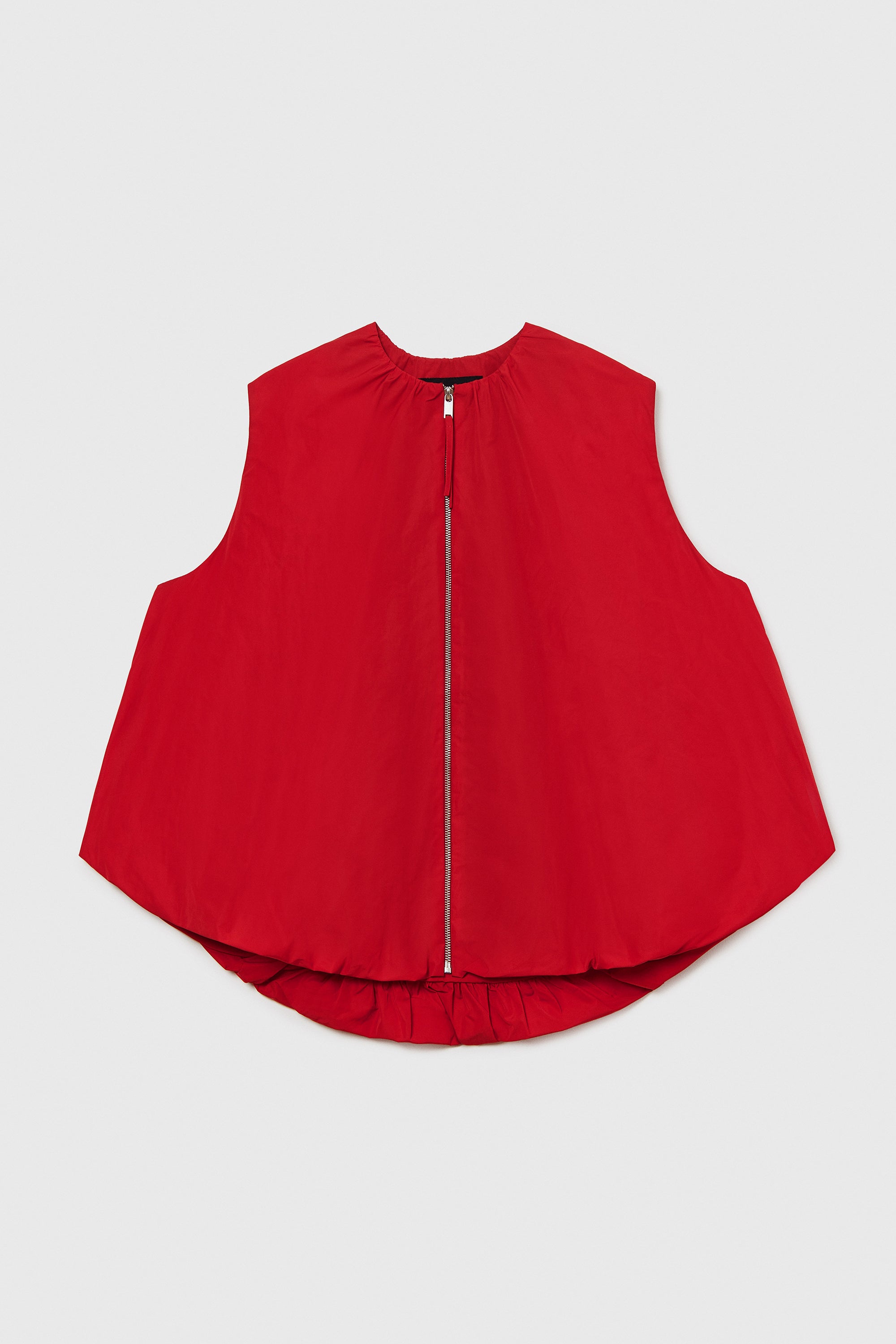 A statement piece in a stunning vivid red. Designed with an oversized balloon silhouette, it features a sleek round neckline, practical side pockets, and a convenient zip closure. Versatile and functional, this waistcoat is perfect for layering across seasons, effortlessly combining style and utility.